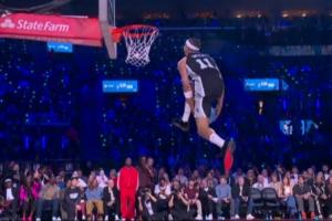 本届扣篮大赛首个满分!卡特·布莱恩特正面胯下换手灌篮一次成功