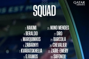 巴黎欧冠名单:阿什拉夫、维蒂尼亚、杜埃、K7在列,登贝莱缺席